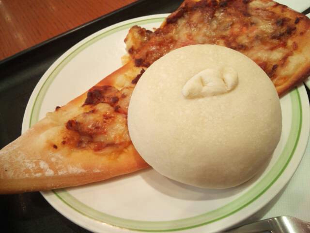 キーマカレーピザと豚まんパンと珈琲で、515円。安っ!